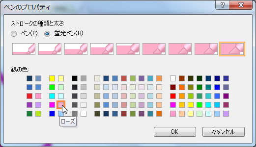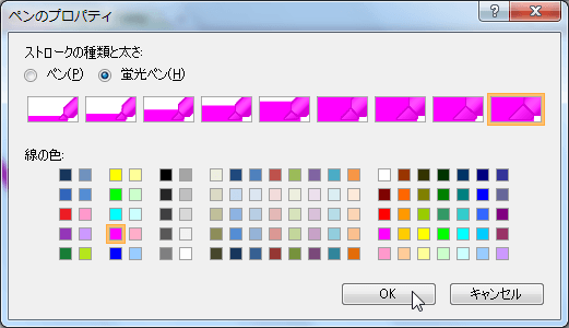 - [ペンのプロパティ]ダイアログボックスで、[蛍光ペン]が選択されていることを確認します。