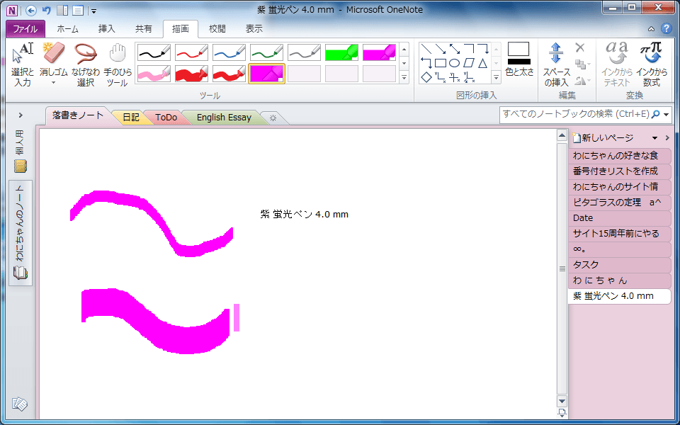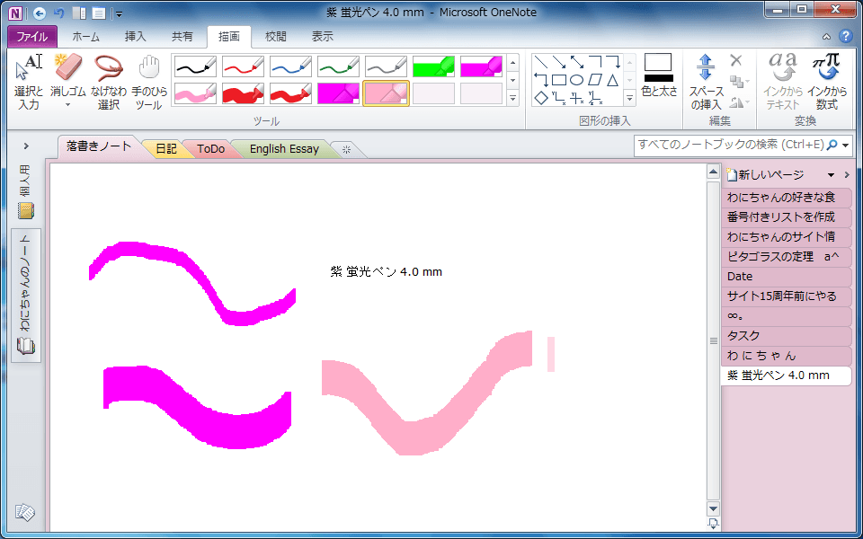 既定のお気に入りのペンにリストされている蛍光ペンの太さは4.0mmで、黄、アクア、緑、紫の4色が登録されています。蛍光ペンの太さは他にも1.5mm、2.0mm、3.0mm、5.0mm、6.0mm、7.0mm、8.0mm、9.0mm、10.0mmが用意されていて、色はペンと同様52色から選択できます。OneNote 2010で蛍光ペンの太さや色を変更するには、[描画]タブの[ツール]の[その他]から[色と太さとその他のオプション]をクリックして、[蛍光ペン]を選択し、太さや色を選択します。