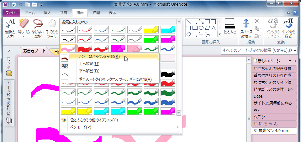 OneNote 2010でお気に入りのペンの一覧は使いやすいように並べ替えたり削除したりできます。お気に入りのペンの一覧から対象となるペンを右クリックして、ショートカットメニューより目的のコマンドを選択します。