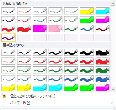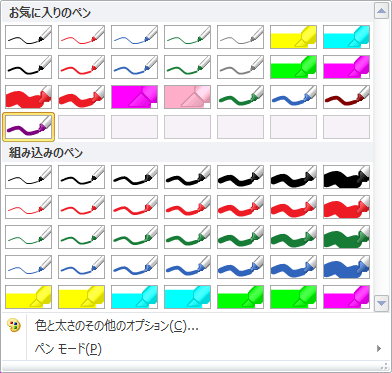 - [描画]タブを開き、ペンの一覧ボックスの右下の[その他]をクリックします。