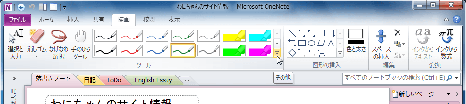誰かに説明するために、ペンをポインターとして使用するには、OneNote 2010で[描画]タブを開き、ペンギャラリーの▼をクリックして、[ペンモード]をポイントし、[ペンをポインターとして使用する]を選択します。