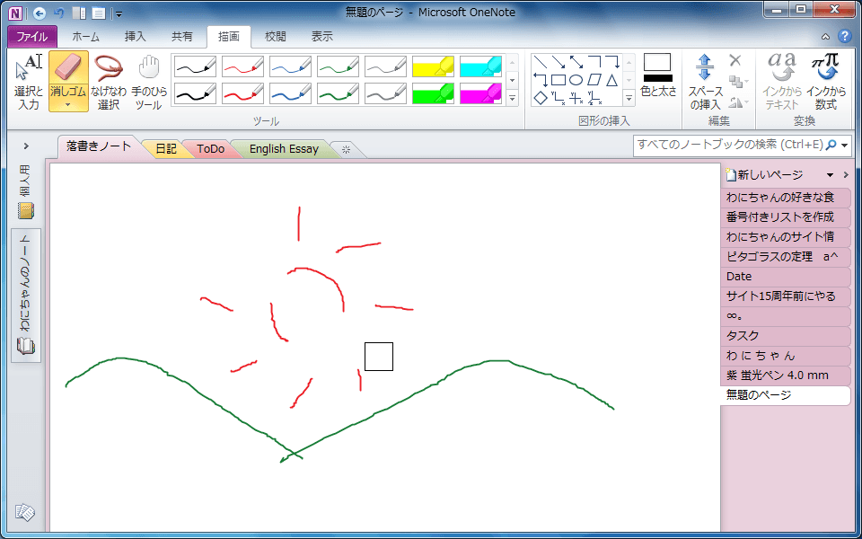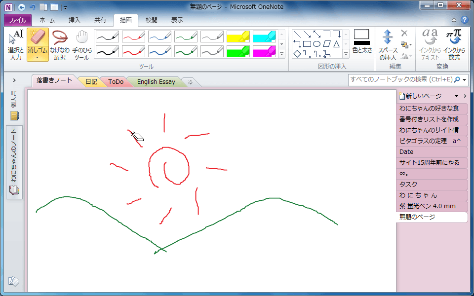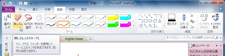 OneNote 2010で描画したものを一部で消すには、[描画]タブの[消しゴム]をクリックします。既定は「ストローク」になっていて、インクや図形の一部を消すのに適しています。消しゴムモードはこのほかにも大中小のサイズが用意されています。