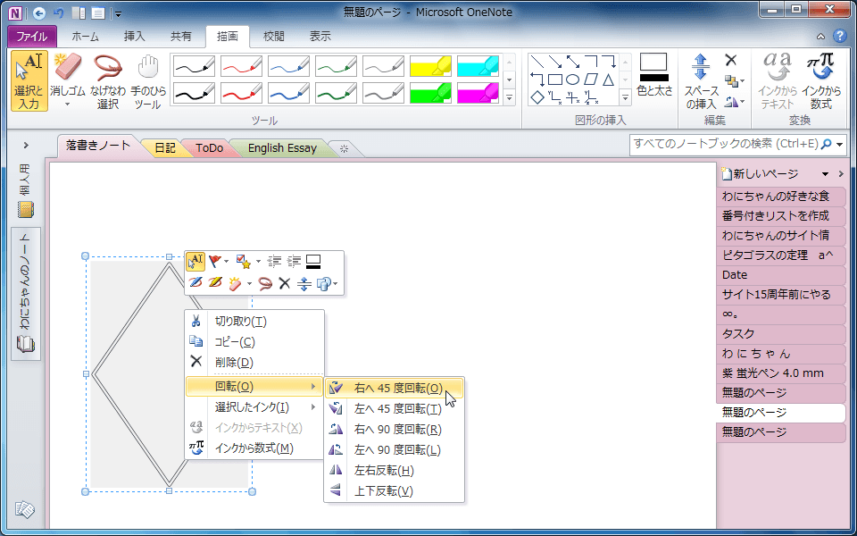 OneNote 2010で回転したい図形を右クリックして、ショートカットメニューより[回転]をポイントし、回転方向と角度を選択します。ただし、回転できるのは45度単位であり、WordやExcelでの図形のように自由に回転はできない制約があります。