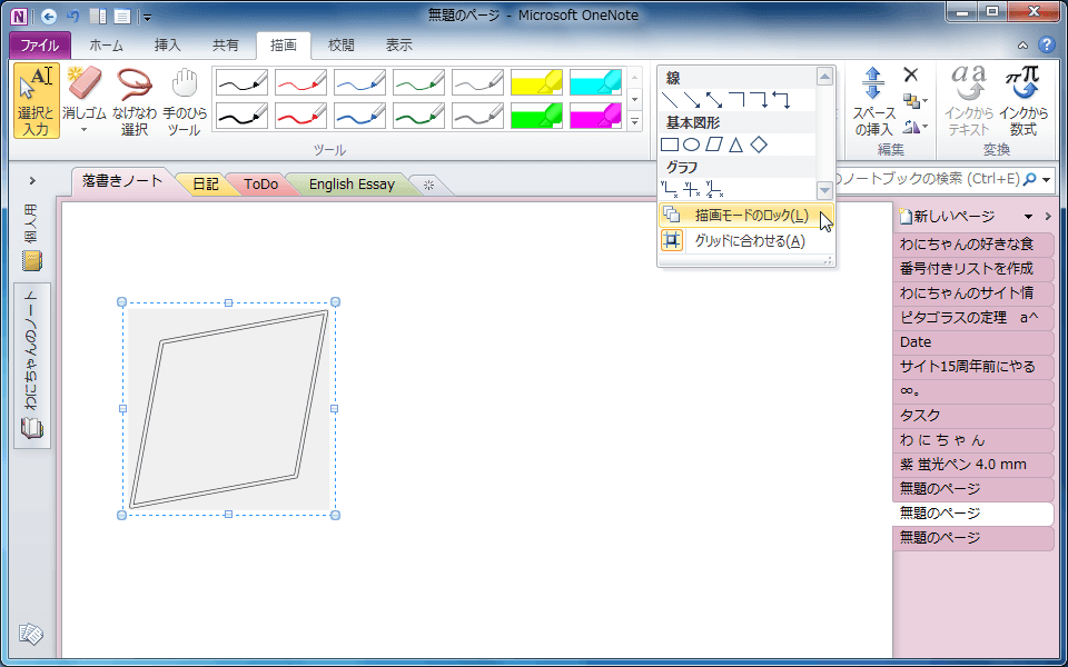 既定では、図形を描くと入力モードに切り替わりますが、同じ図形を繰り返して描画するには、描画モードをロックするとOKです。OneNote 2010で[描画]タブを開き、[図形]ギャラリーの▼をクリックして、[描画モードのロック]を選択します。