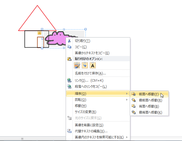 - 右クリックして、ショートカットメニューより[順序]をポイントし、一覧から[前面に移動]を選択します。