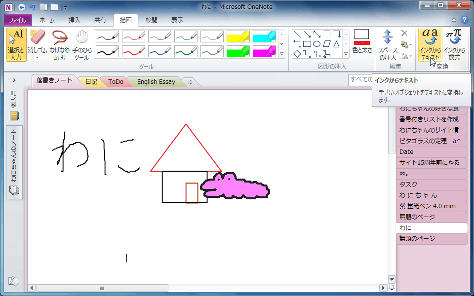 OneNote 2010で開いているページの手書きオブジェクトをテキストに変換するには、[描画]タブを開き、[変換]グループの[インクからテキスト]を選択します。