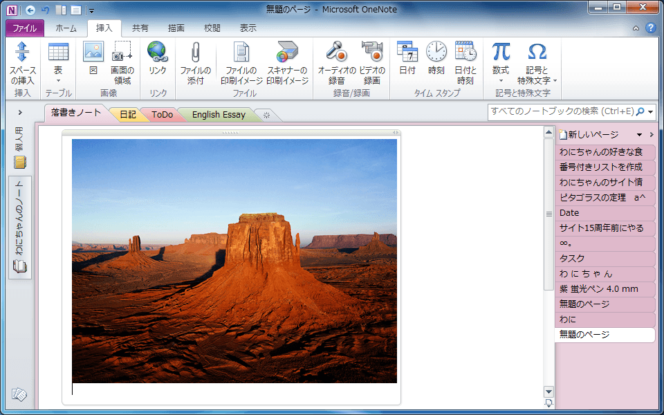 OneNote 2010でお使いのコンピューターまたは接続されているコンピューターから画像を挿入するには、[挿入]タブを開き、[画像]グループの[図]をクリックして、対象となる画像ファイルを指定します。
