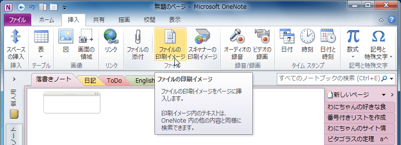 OneNote 2010で[挿入]タブを開き、[ファイル]グループの[ファイルの印刷イメージ]を選択して、対象となるファイルを選択します。印刷イメージ内のテキストはOneNoteで検索できるので便利です。