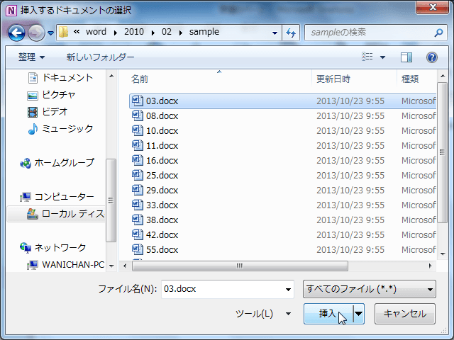 - [挿入するドキュメントの選択]ダイアログボックスが表示されたら、印刷イメージを追加したいファイルを選択して[挿入]ボタンをクリックします。