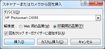 - [スキャナーまたはカメラから図を挿入]ダイアログボックスでデバイスを選択します。