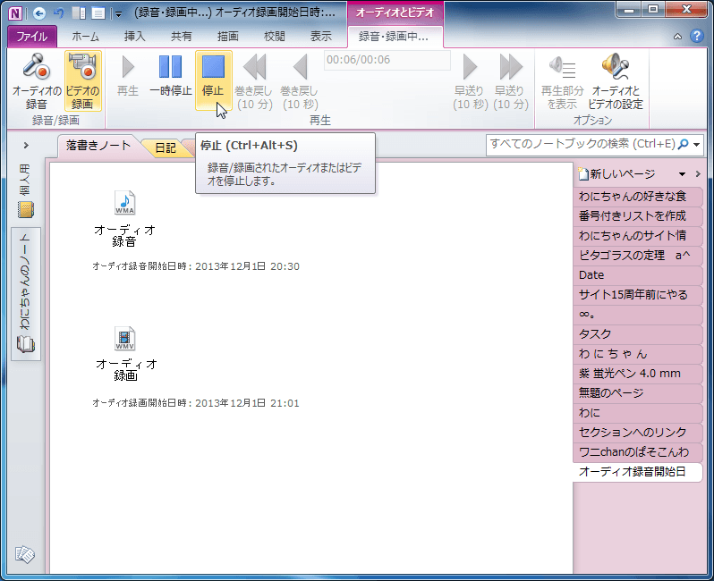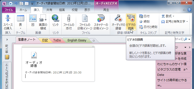 OneNote 2010でコンピュータにWebカメラが搭載されている場合は、ビデオ録画を開始することができます。[挿入]ボタンをクリックし、[録音/録画]グループの[ビデオの録画]をクリックします。[停止]をクリックすると録画は終了します。録画が終了すると、録画開始時間にノートが関連付けられます。