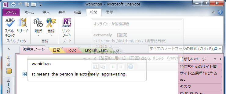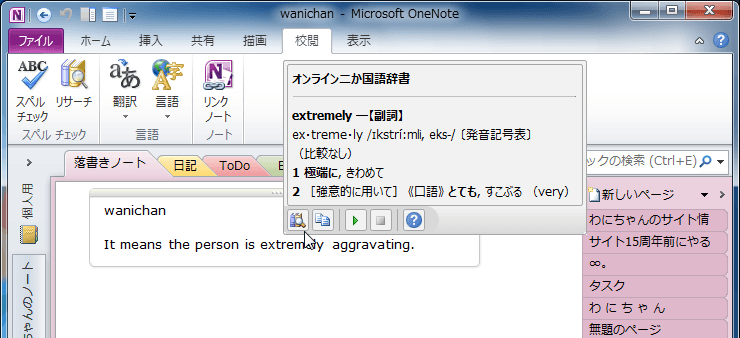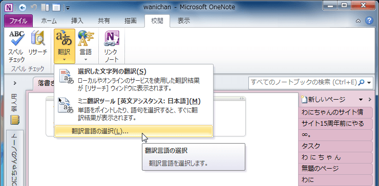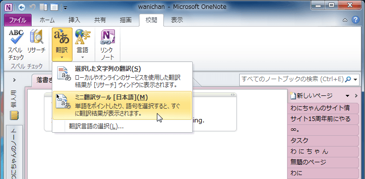 OneNote 2010で[リサーチ]作業ウィンドウを表示させずに、調べたい単語をポイントするだけでその意味を表示するには、[校閲]タブの[言語]グループにある[翻訳]をクリックして、[ミニ翻訳ツール]を有効にするとOKです。