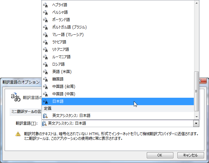 - 既定の翻訳は[英文アシスタンス:日本語]になっています。日本語に翻訳したい場合は、下の図のように翻訳先の言語[日本語]を選択して[OK]ボタンをクリックします。