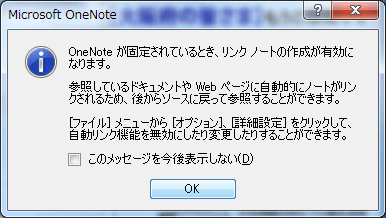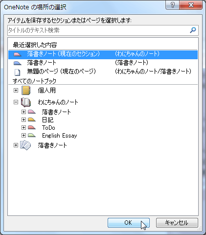 - [OneNoteの場所の選択]ダイアログボックスで、リンクノートの保存先を指定して[OK]ボタンをクリックします。