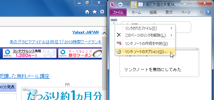 - [ファイル]タブを開き、[オプション]をクリックして、[OneNoteオプション]ダイアログボックスの[詳細設定]を開きます。ドッキングウィンドウが表示されている場合はリンクノートのアイコンをクリックして[リンクノートのオプション]を選択します。
