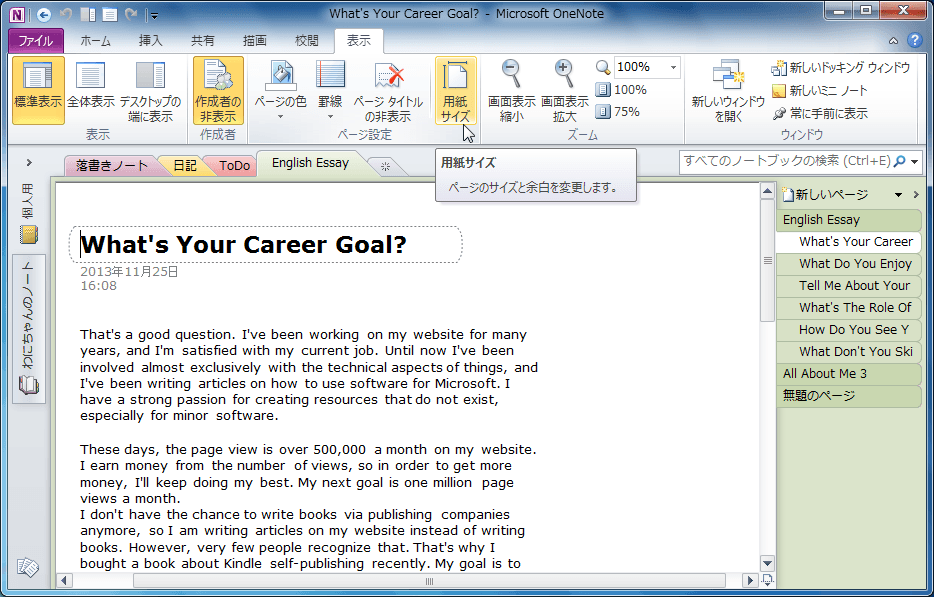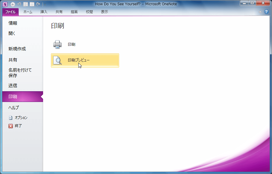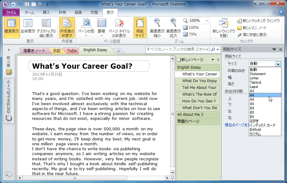 OneNote 2010の[印刷プレビューおよび設定]ダイアログボックスで[用紙サイズ]ボックスにて用紙サイズを指定します。[表示]タブから[用紙サイズ]作業ウィンドウでも設定が行えます。