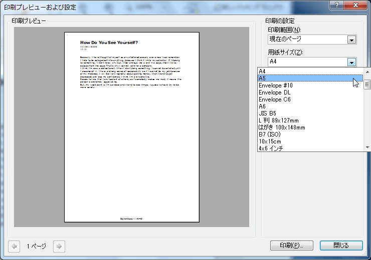 - [印刷プレビューおよび設定]ダイアログボックスが開いたら、[用紙サイズ]ボックス一覧から用紙サイズを選択します。