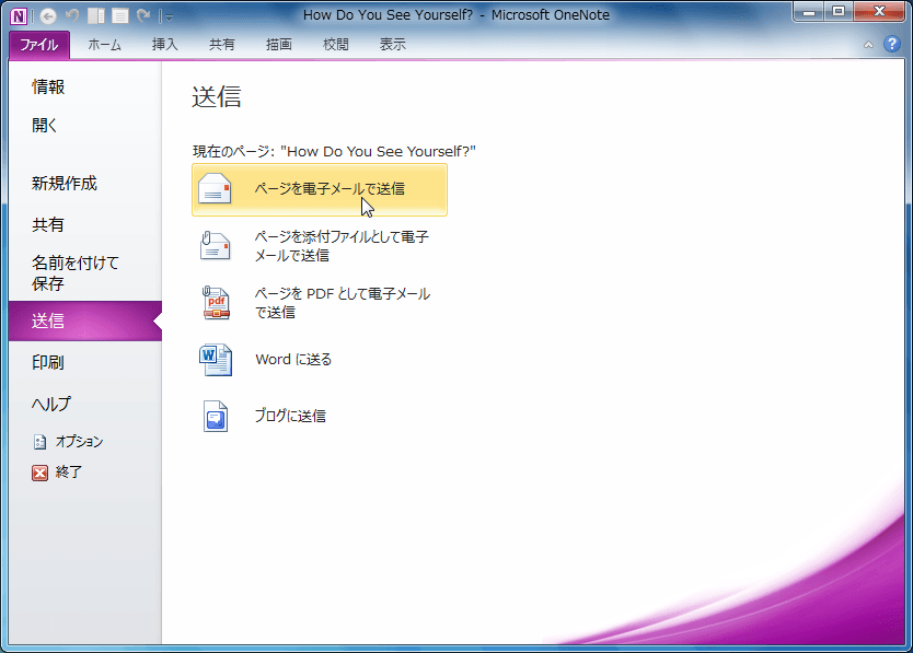 OneNote 2010でページの内容を電子メールで送信するには、該当するページを開き、[共有]タブを開いて[ページを電子メールで送信]をクリックするか、[ファイル]タブを開いて[送信]を選択し、[ページを電子メールで送信]を選択します。電子メールの本文の最後には「Microsoft OneNote 2010 で作成されました。」という文字列が自動挿入されます。