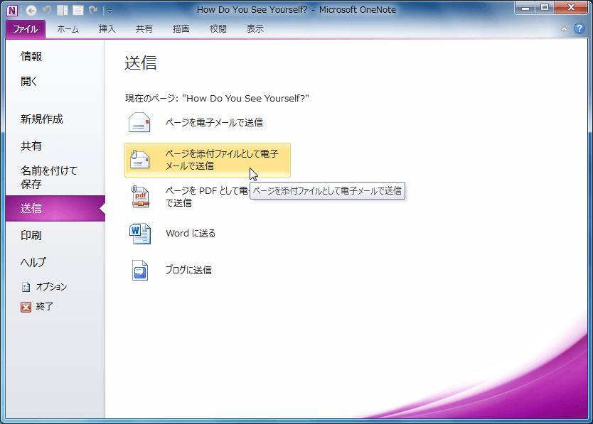 OneNote 2010でページを添付ファイルとして送信するには、該当するページを開き、[ファイル]タブを開いて[送信]を選択し、[ページを添付ファイルとして電子メールで送信]を選択します。すると、OneNoteセクションファイルとWebページ形式の2つ添付され、本文に「.mht 添付ファイルをクリックして、Web ページとしてノートを表示します。」が自動挿入されます。