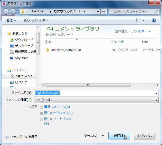 OneNote 2010で現在のセクションを保存する形式として、通常のOneNoteセクション(*.one)の他に、Word文書、PDFなど別の形式に指定できます。セクション内のページすべてをOneNoteを持っていない人に共有するには、PDF形式で保存してもよいでしょう。PDF形式で保存すると、ページごとに改ページされます。