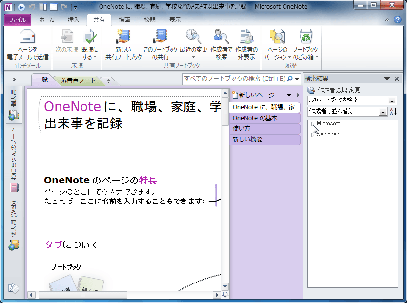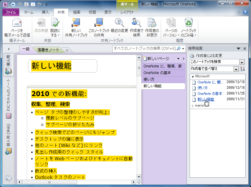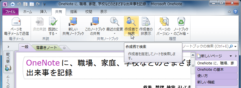 OneNote 2010で現在作業中のノートブックを編集したユーザーと編集内容を表示するには、[共有]タブを開き、[共有ノートブック]グループの[作成者で検索]をクリックします。