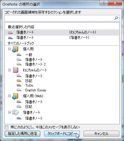 - もし[OneNoteの場所の選択]ダイアログボックスが表示されたら、スナップショットを貼り付ける場所を指定します。ここでは[クリップボードにコピー]ボタンをクリックします。