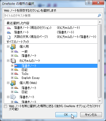 - Webノートを保存するセクションを指定して、[OK]ボタンをクリックします。