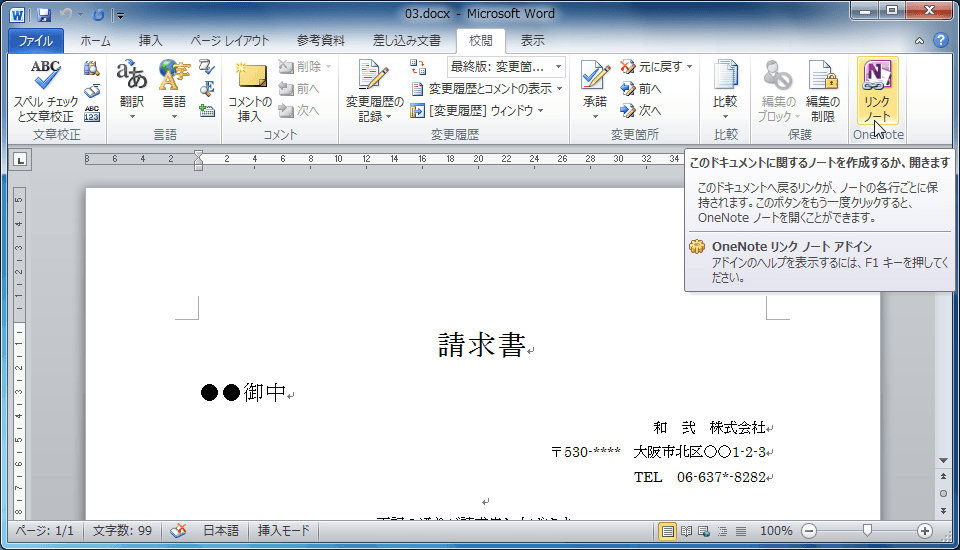 - [校閲]タブを開き、[OneNote]グループの[リンクノート]をクリックします。