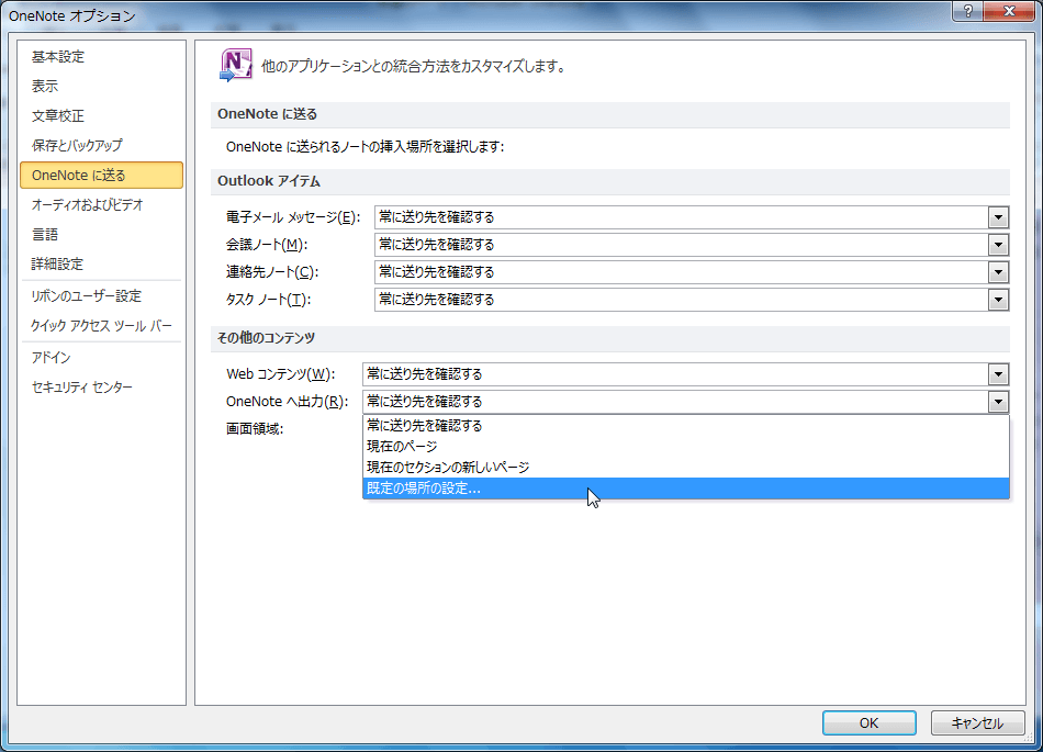 - [その他のコンテンツ]欄の[OneNoteへ出力]ボックス一覧から[既定の場所の設定]を選択します。