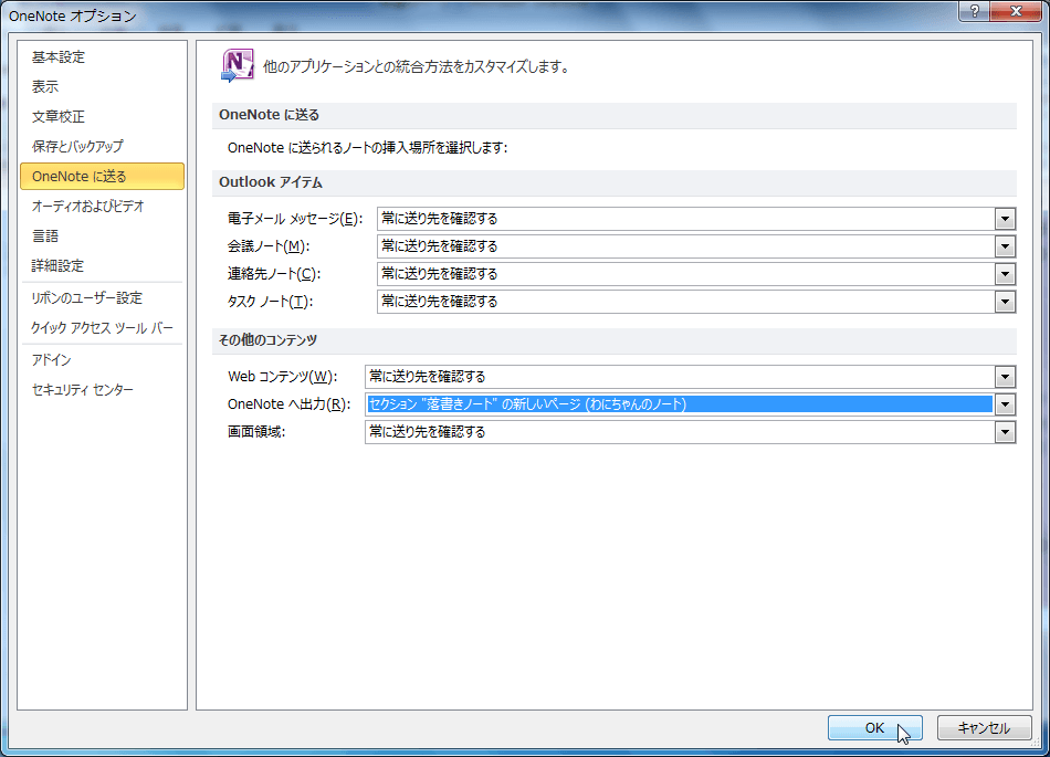- [OneNoteオプション]ダイアログボックスの[OneNoteに送る]タブを開きます。