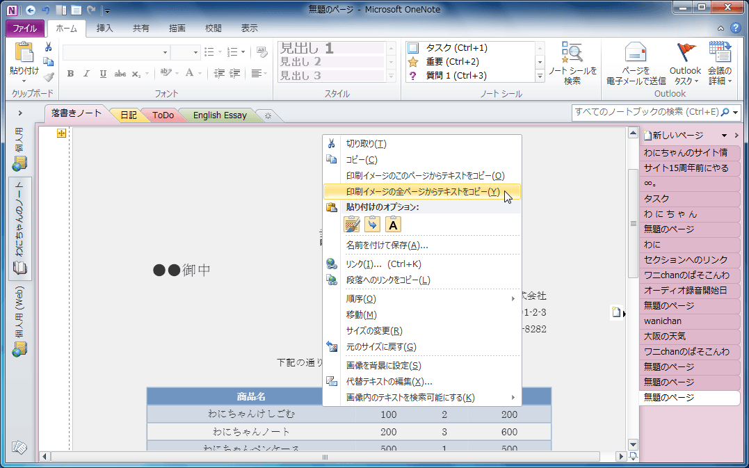 OneNote 2010でページに挿入された印刷イメージの全ページからテキストをコピーするには、その印刷イメージを右クリックしてショートカットメニューより[印刷イメージの全ページからテキストをコピー]を選択します。