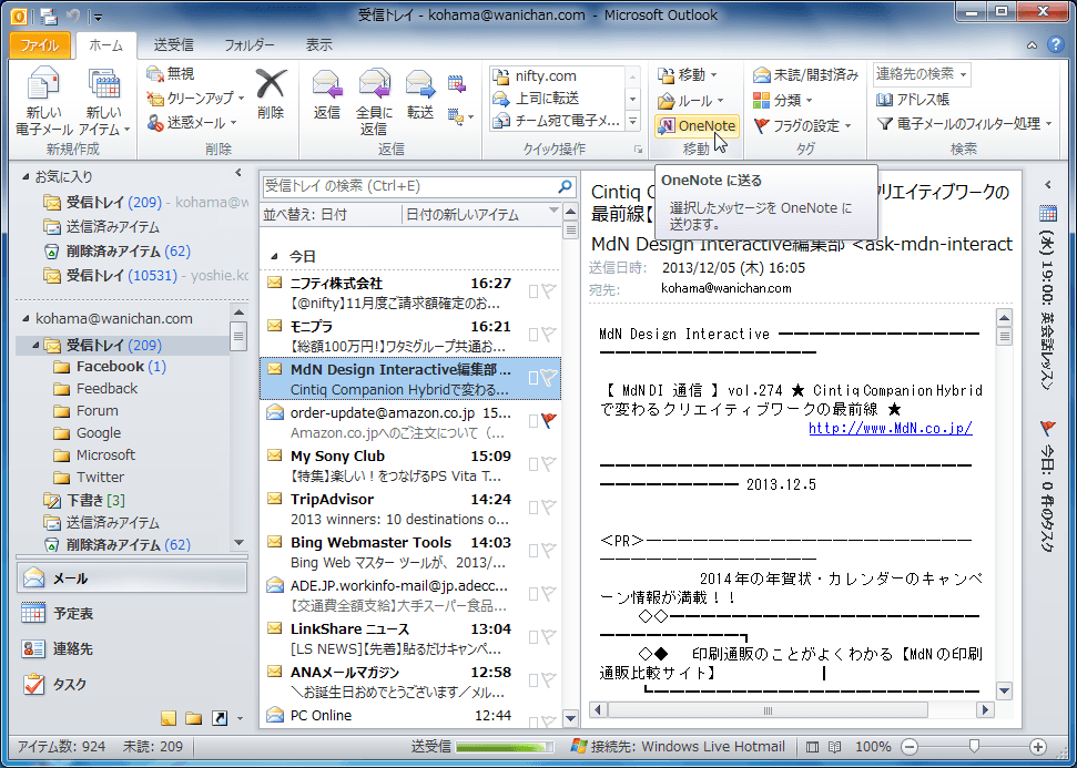 選択したメッセージをOneNoteに送るには