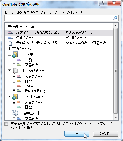 - 電子メールを保存するセクションまたはページを選択して[OK]ボタンをクリックします。