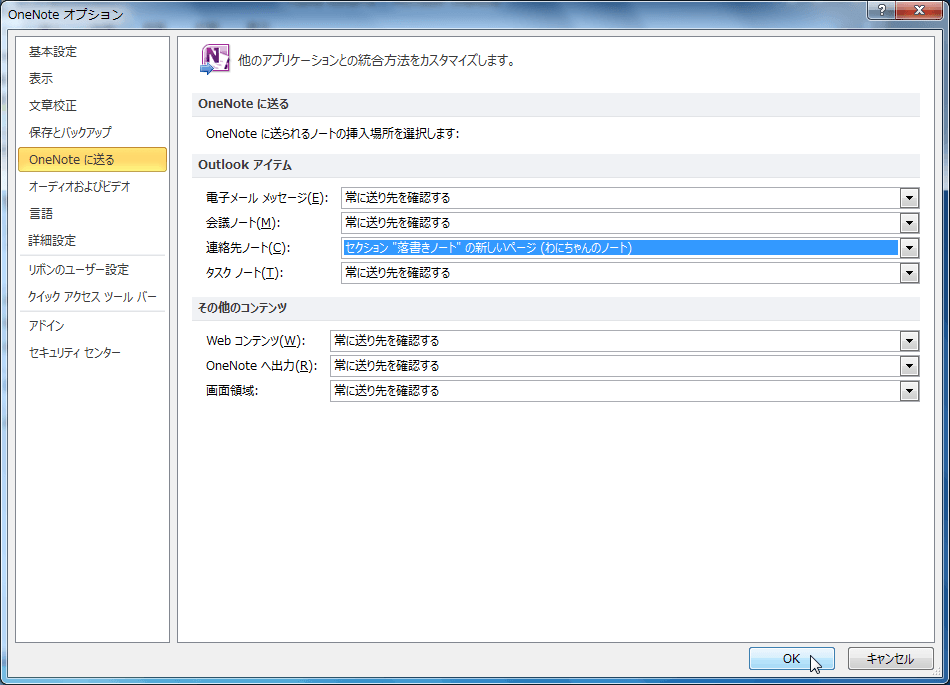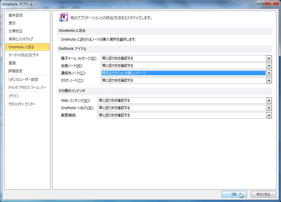 - [OneNoteオプション]ダイアログボックスの[OneNoteに送る]タブを開きます。