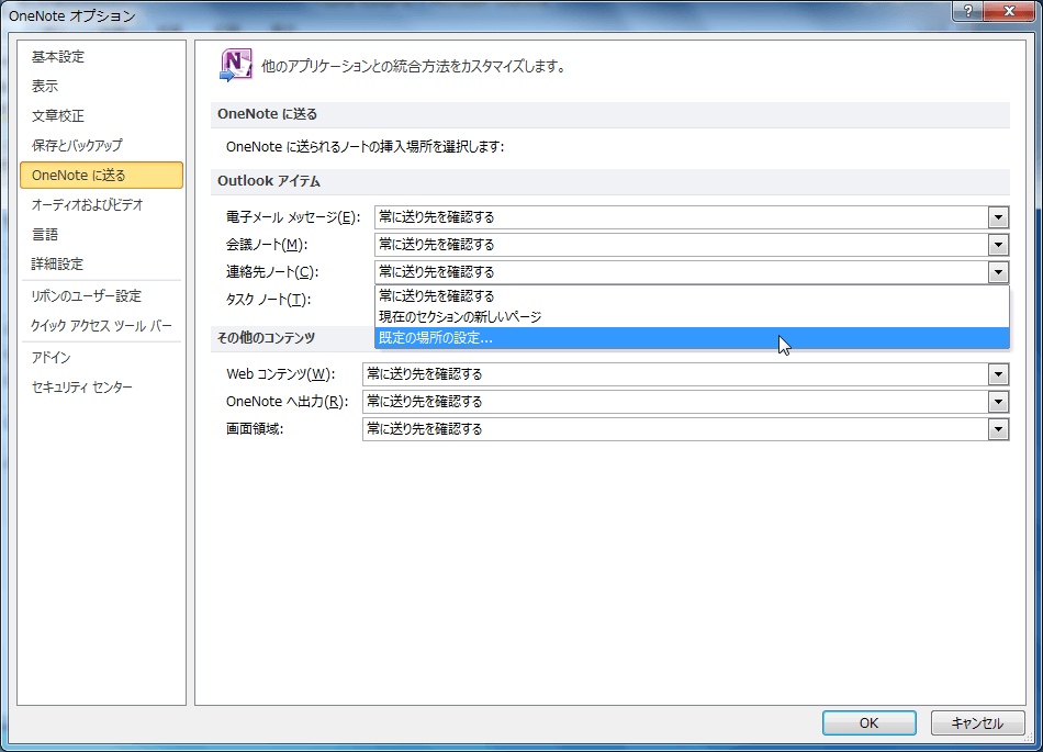 OneNote 2010での既定では、連絡先ノートの送り先は毎回確認する画面が表示されます。もし、その送り先を固定したい場合、[OneNoteオプション]ダイアログボックスの[OneNoteに送る]タブを開き、[Outlookアイテム]の[連絡先ノート]ボックス一覧から選択します。