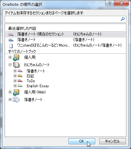 - [Outlookアイテム]の[タスクノート]ボックス一覧から[現在のセクションの新しいページ]を選択して、[OK]ボタンをクリックします。