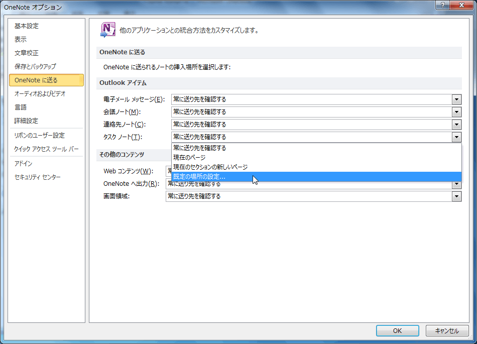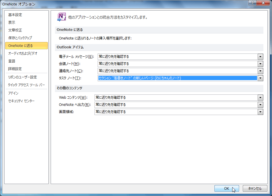 もし、その送り先を固定したい場合、[OneNoteオプション]ダイアログボックスの[OneNoteに送る]タブを開き、[Outlookアイテム]の[タスクノート]ボックス一覧から選択します。