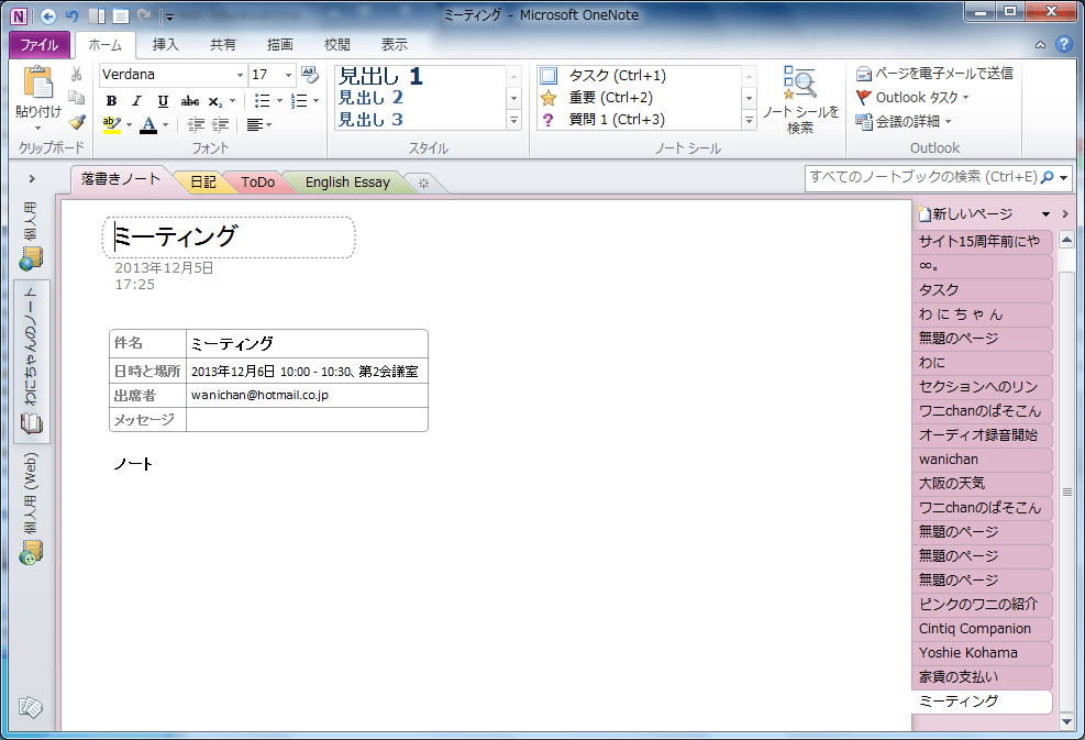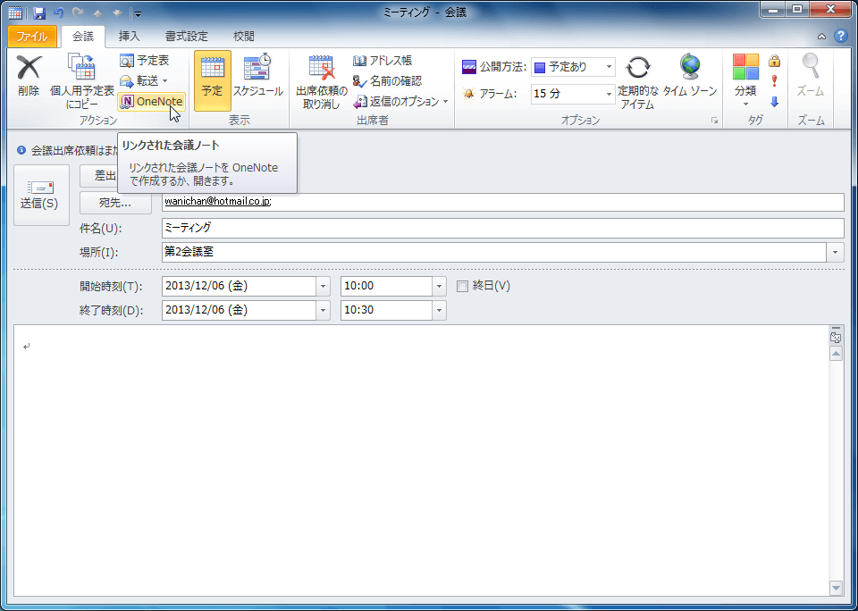リンクされた会議ノートをOneNoteで開くか作成するには