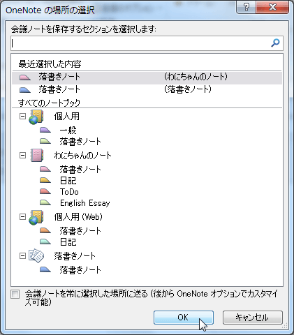 - 会議ノートを作成するセクションまたはページを選択して[OK]ボタンをクリックします。