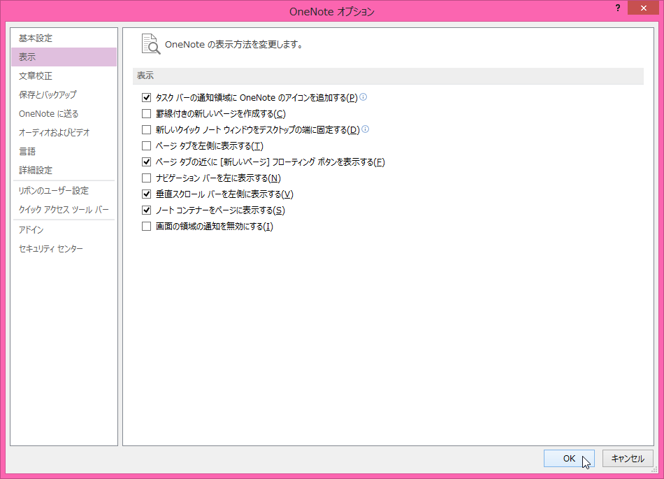 OneNote 2013既定では垂直スクロールバーは右側に表示されますが、タッチパネル操作で左手で操作したい場合、左側に表示することができます。[OneNoteのオプション]ダイアログボックスの[表示]を開き、[垂直スクロールバーを左側に表示する]のチェックを付けます。