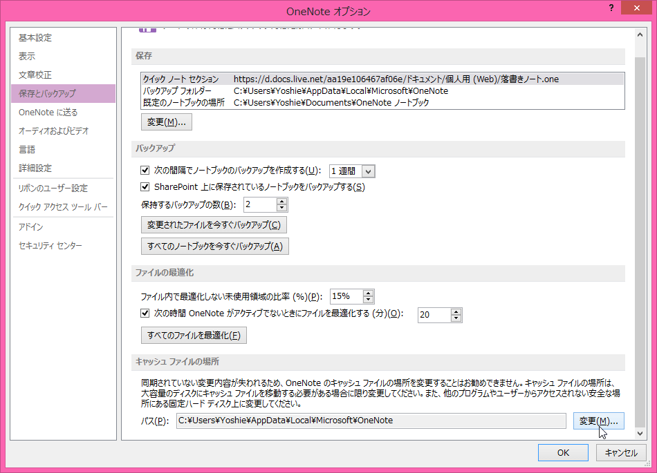 大容量のディスクにキャッシュファイルを移動したい場合、キャッシュファイルの場所を変更することができます。[OneNoteのオプション]ダイアログボックスの[保存とバックアップ]を開き、[キャッシュファイルの場所]グループのパス情報を変更します。
