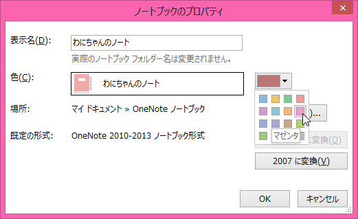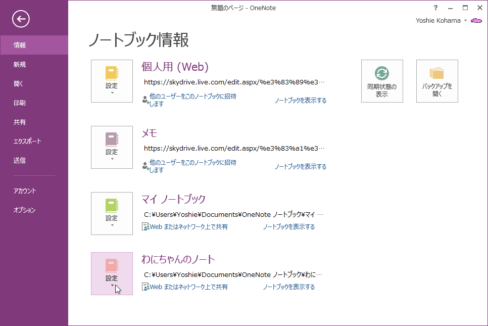 - [ノートブック情報]ウィンドウが表示されたら、色を変更したいノートブックの[設定]ボタンをクリックします。