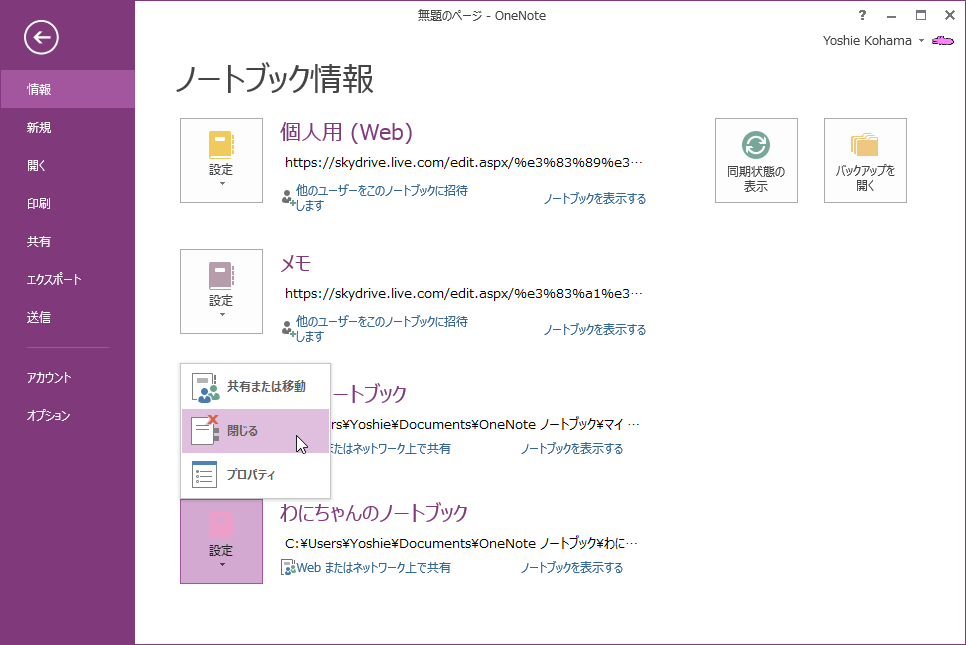 OneNote 2013で[ファイル]タブを開いてノートブック情報を表示し、閉じたいノートブックの[設定]をクリックして[閉じる]を選択します。