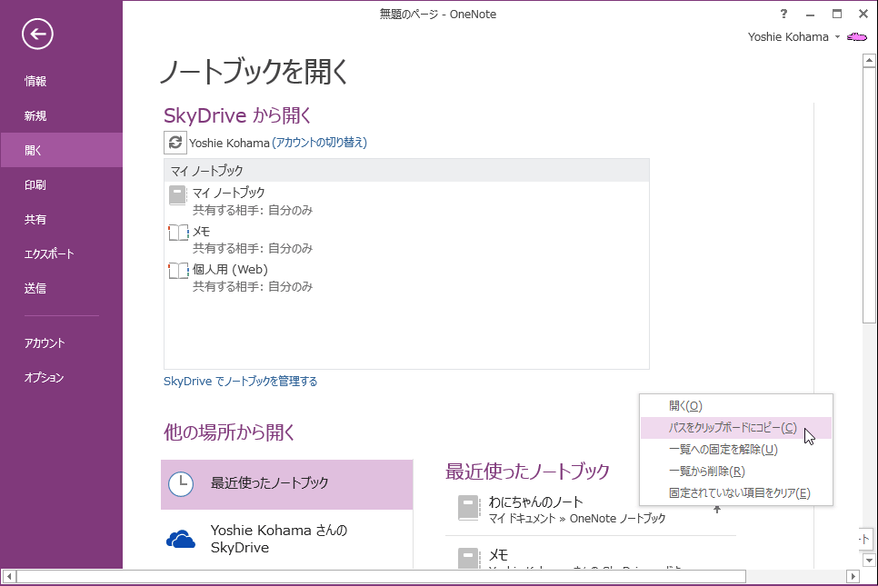 OneNote 2013で最近使ったノートブックのパスをクリップボードにコピーするには、[ファイル]タブを開き、[開く]を選択して、[最近使ったノートブック]一覧からコピーしたいノートブックを右クリックしショートカットメニューより[パスをクリップボードにコピー]を選択します。