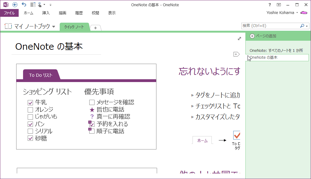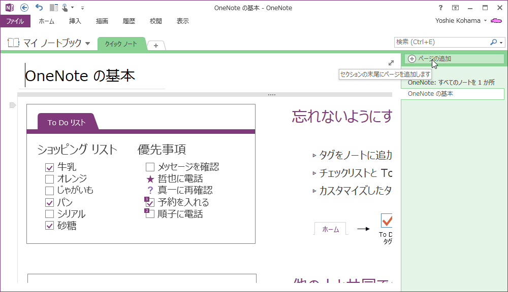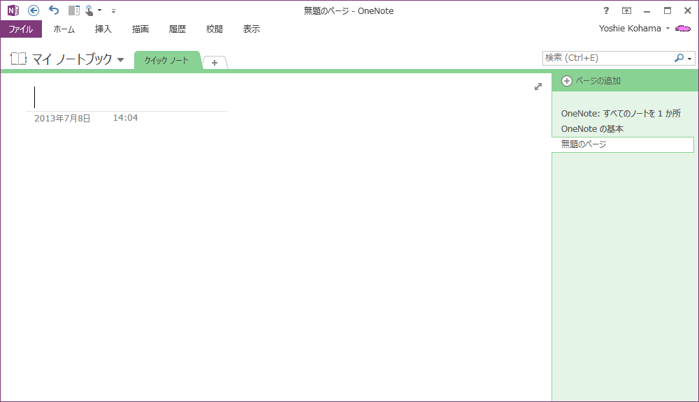 OneNote 2013でページタブの上の[ページの追加]をクリックすると、セクションの最後にページが追加されます。ショートカットキーはCtrl+Nです。