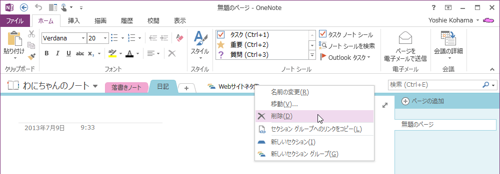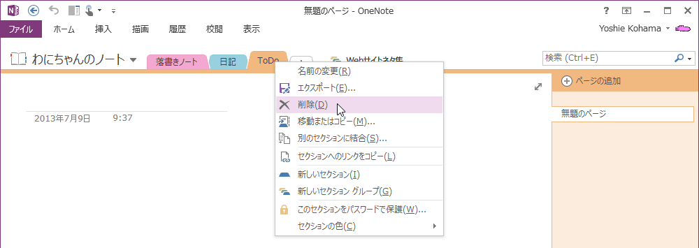 OneNote 2013で削除したいセクションを右クリックして、ショートカットメニューより[削除]をクリックするか、削除したいセクションを選択して[ホーム]タブの[削除]をクリックします。削除されたセクションはノートブックのごみ箱に移動され、60日間保持されます。