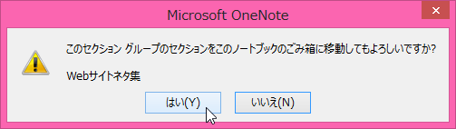 - 「次のセクショングループのセクションをこのノートブックのごみ箱に移動してもよろしいですか?」という確認メッセージが表示されるので、削除する場合は[はい]ボタンをクリックします。
