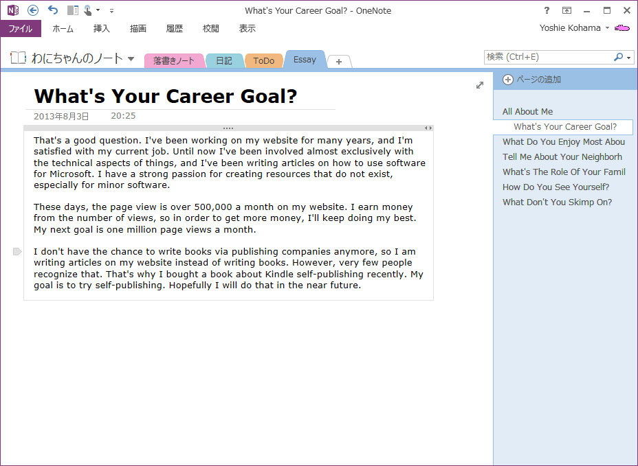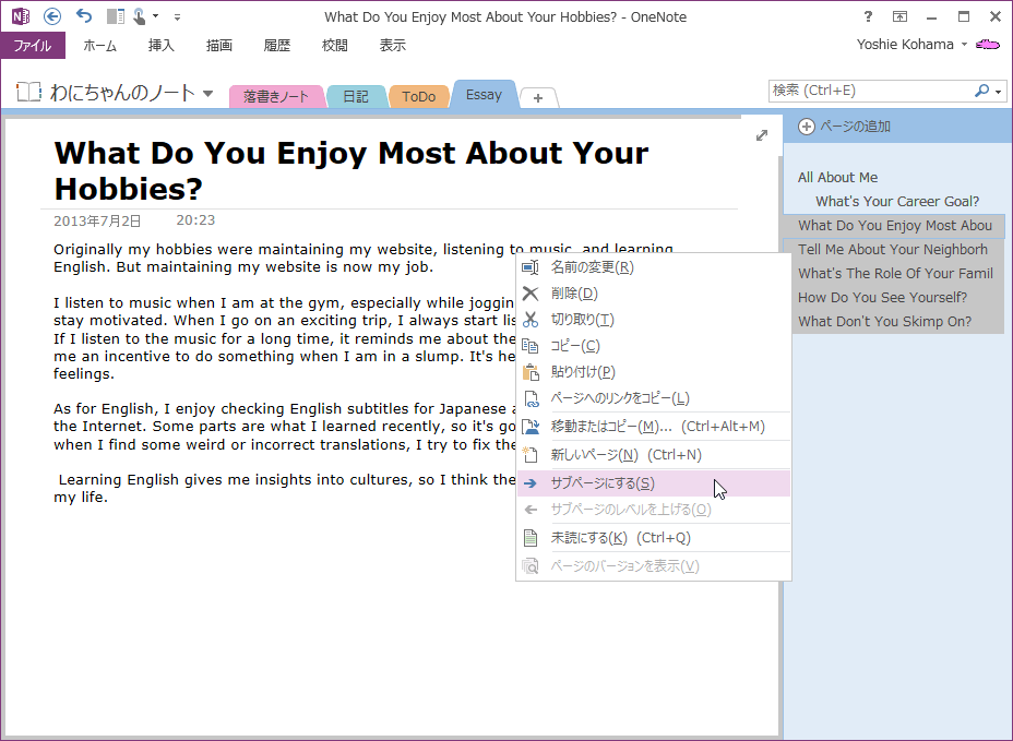 OneNote 2013でサブページにしたいページタブを右クリックして、ショートカットメニューより[サブページにする]を選択します。なお、複数のページをまとめてサブページにすることも可能です。