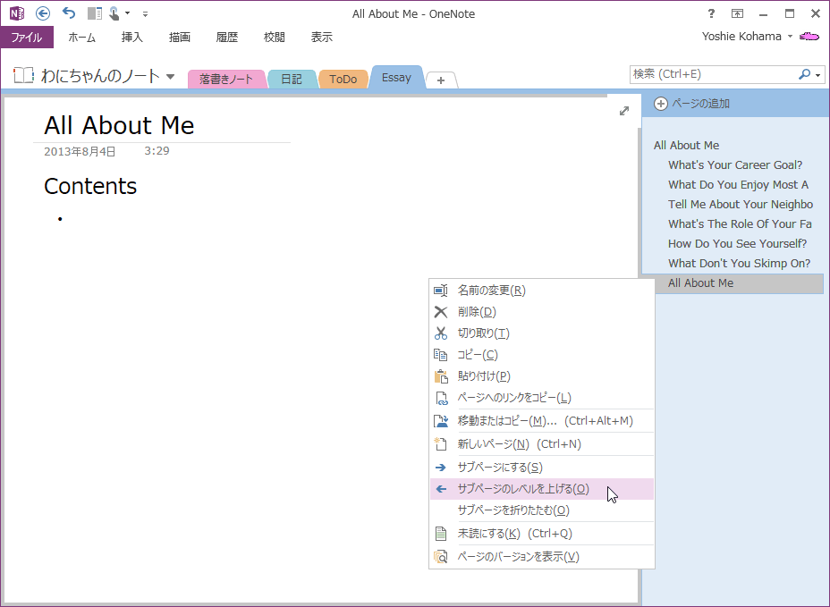- レベルを上げたいサブページのタブを右クリックしてショートカットメニューより[サブページのレベルを上げる]を選択します。