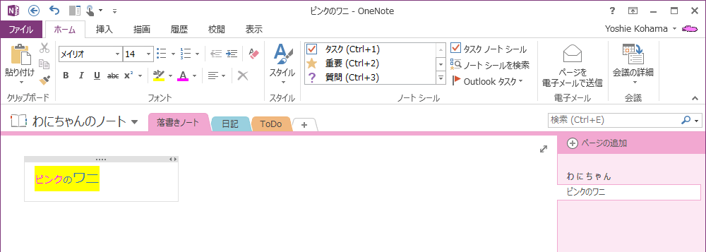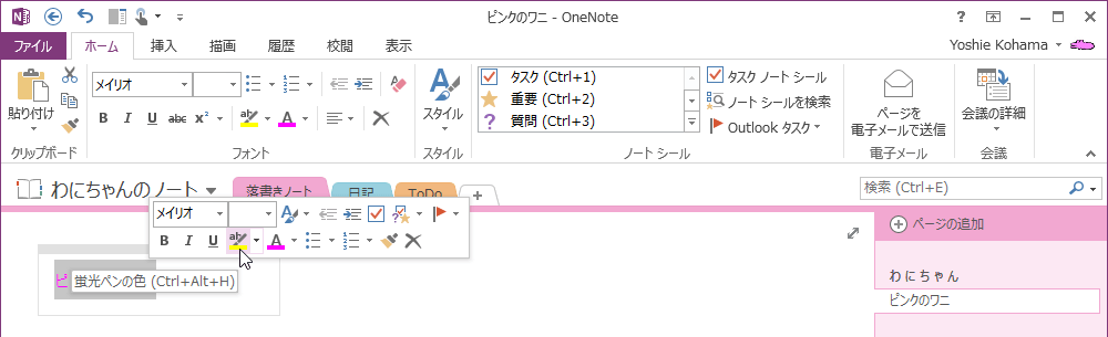 OneNote 2013で太字にしたり、斜体文字にしたり、下線をつけたりするには、対象となる文字を選択して、[ホーム]タブを開き、[フォント]グループのそれぞれのボタンを利用するか、ミニツールバーを利用します。リボンコマンドが非表示の場合は、ミニツールバーの利用が便利です。